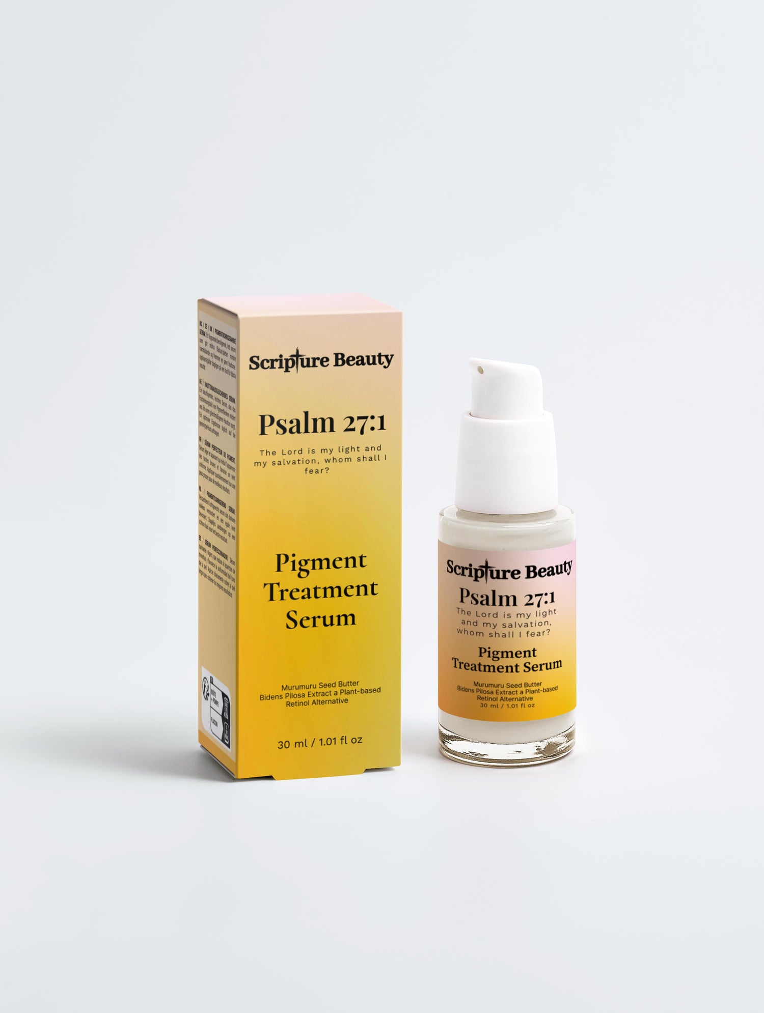 Psalm 27:1 Pigment Treatment Serum is a targeted solution to reduce uneven spots, even out skin tone, and promote a radiant, blemish-free complexion.